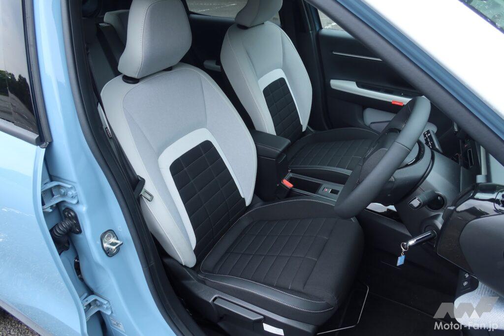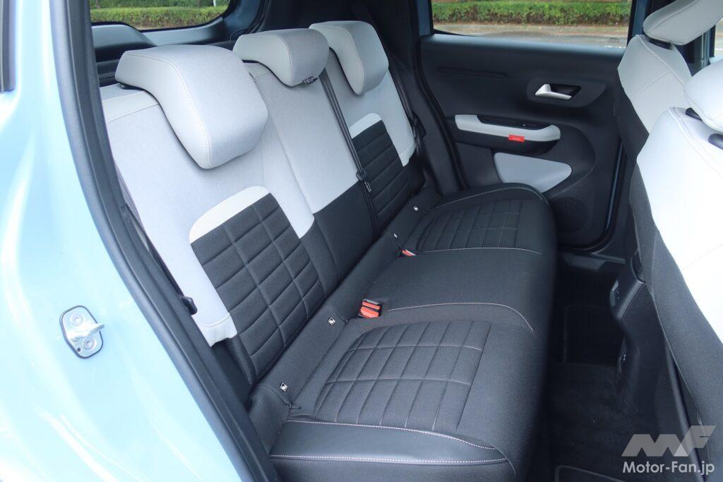板チョコ状のクッション部が特徴のシートはデザイン性の高さもさることながら、表層部に採用した厚みのある高密度フォームによる独特の触感が魅力。前席シートの包み込まれる感覚も好印象だったが、圧巻は後席。クッション部は前席に比べて一段とソフトで、フカッとした沈み込み感は感動的ですらある。家族や友人を誘いたくなる座り心地だ。これを確かめるだけが目的でショールームを訪れる価値があると感じているし、後席オブ・ザ・イヤーがあれば差し上げたいくらいだ。車両サイズを考えれば、後席の居住スペースは充分であり、快適に過ごせる。