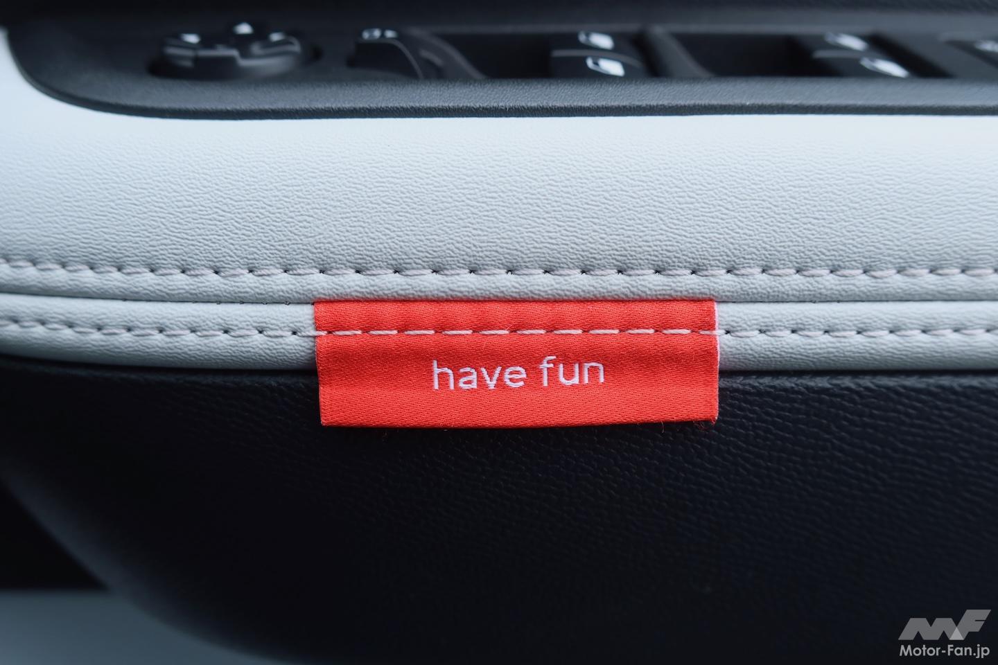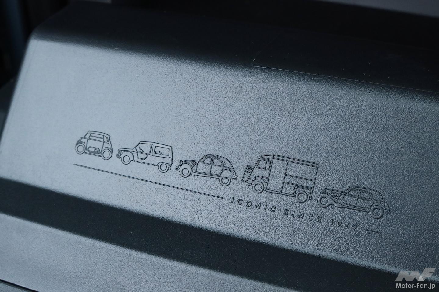 インテリアにはかわいい仕掛けもある。種明かししてしまうと(ここから先はネタバレ注意)、リヤウインドウにはエッフェル塔にノートルダム寺院をはじめとするパリの名所や雄鶏がシルクスクリーンで描かれ(写真、撮り忘れました)、グローブボックスを開くと、シトロエンの歴代名車をモチーフにしたイラストが現れる。また、前後席のアームレスには「be cool」や「have fun」などのポジティブな気分になるタグが添えられている。こうした小さな仕掛けが乗車時の気分を軽やかにする。