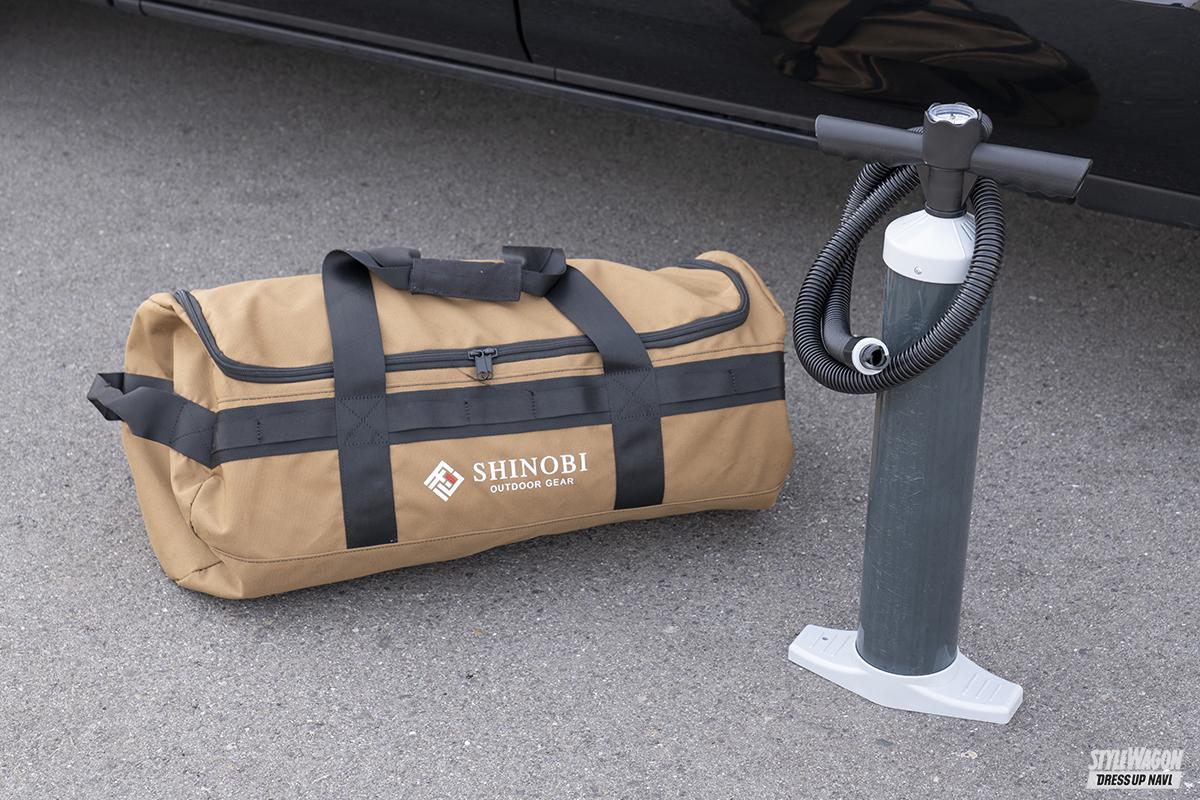 車中泊の際に2&3列目シートを後方に倒しても、段差ができるため完全フラットにならない。そこに従来のエアマットを敷いても、荷重をかけると面が凸凹してしまう。しかしシノビの車中泊キットはSUPボートの技術を応用し、空気を入れて膨らませるにもかかわらずしっかりとした強度を確保。