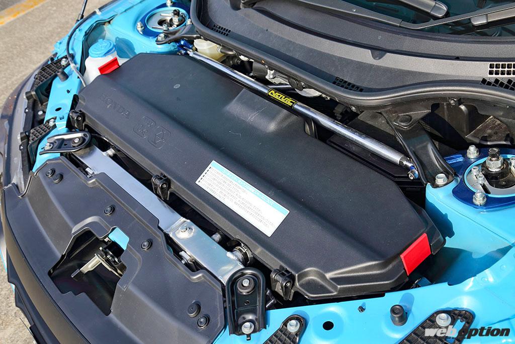 吸気系は、試作のオリジナルエアクリーナーを装着。吸気温度の上昇が著しいS660に合わせた設計で、ファンネル形状を採用しつつカバーを設ける事で熱害をシャットアウトする構造だ。サイドダクトから、ダイレクトにフレッシュエアを導くためのホースも設置されている。