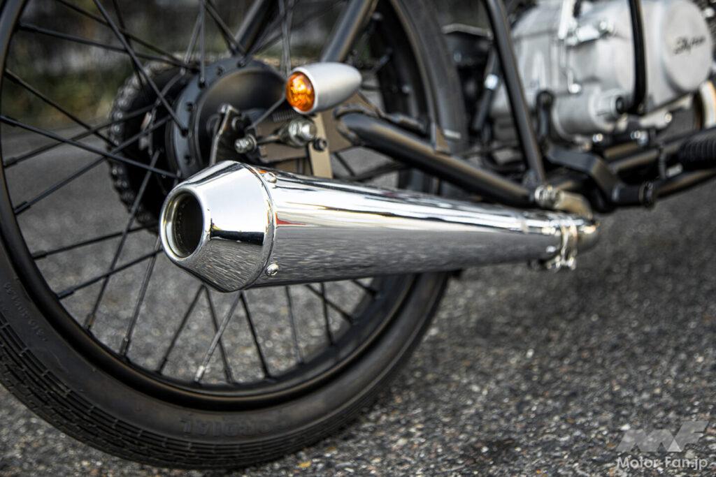 車体構成はとにかくシンプルで、現代的な電子装備はナシ。エンジンはキャブレター仕様のキック始動のみだ。俗に言う中華カブ系、空冷4ストロークOHC単気筒122.9ccエンジンを搭載しており、市販車は黒エンジン+マットブラックのキャブトンタイプマフラーが標準になる。試乗車はカスタムホビーショップアローズが製作したリバースコーンタイプのマフラーと、NIBBI製φ22キャブレター(純正はφ19)を装着。ウインカーも標準はブラックボディを採用する。