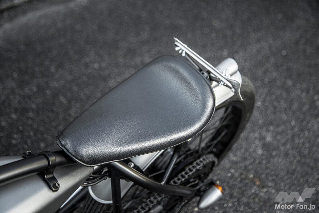 コンパクトなレザー張りソロシートがスタイルのアクセントに。快適性よりも造形美を重視したデザインが際立つ。