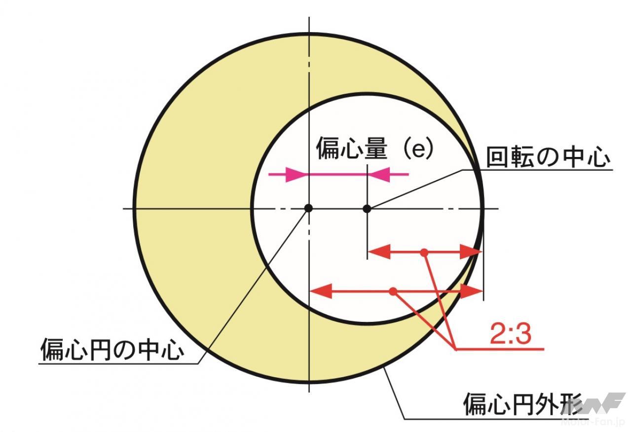 ローターの頂点が描く軌跡が繭形のハウジング形状である。トロコイド曲線といわれるが、その軌跡(描き方)は図1を参照されたい。アームの先端にペンを取り付けて、中の外歯を固定し、内歯をからませながら偏心回転させたときに描かれる軌跡がローターハウジングの基本形状になる。またローターがこの中で回転できるのは、偏心しているからこそであり、ちょうど偏心量の部分がレシプロのコンロッドとクランクの役割を担う。もし偏心が存在していなければ、仮に燃焼エネルギーを受けてもローターの1辺は軸中心方向に圧力を受けるだけで回転エネルギーには変換されない。