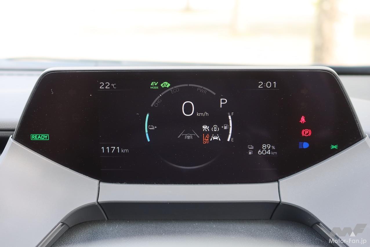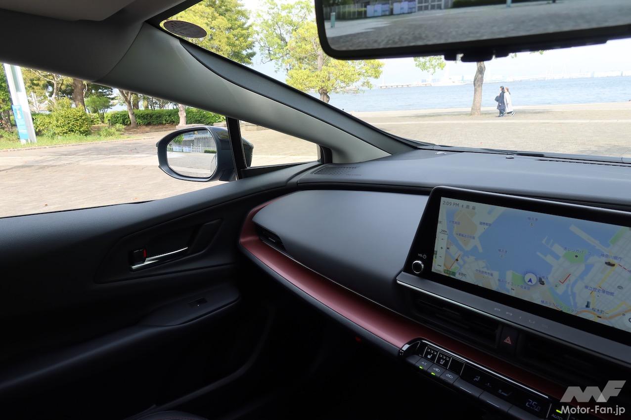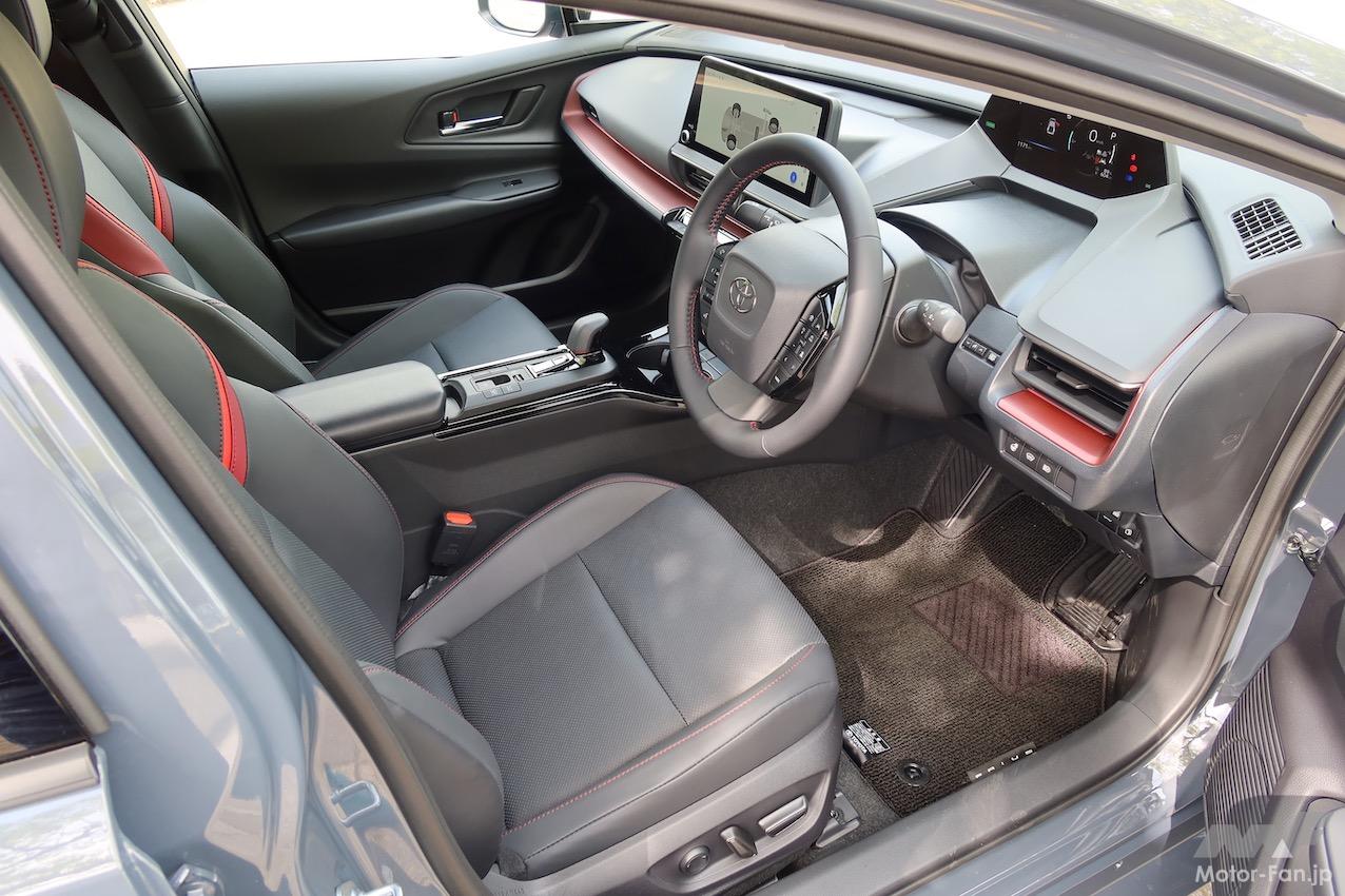 でも、乗り心地は犠牲にしていない。実際、「硬い」と感じるシーンには遭遇しなかった。先代プリウスPHVと乗り比べると、進化ぶりがよくわかる。あくまで新型との対比だが、先代はロール方向に落ち着きなく揺れがちな印象がある。対照的に新型はドシッと落ち着いており、荒れた路面では微細な振動を上手に遮断している印象。