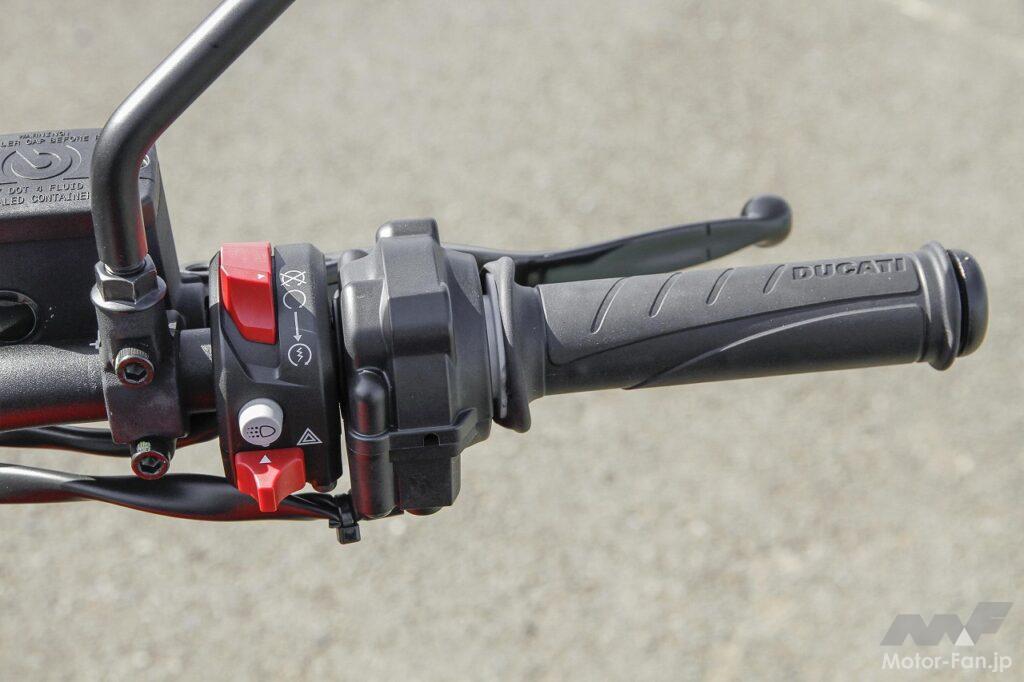 始動すると、テルミニョーニマフラーからは迫力あるサウンドが放たれる、と思いきや、なんとも静かなエキゾーストノートが発せられ、拍子抜けしてしまいました。さまざまな規制に対応した結果なのでしょうが、もう少し音量があったほうがドゥカティらしいと感じます。ただし現実的には、早朝の住宅地でもエンジンをかけることができるのはありがたいですね。