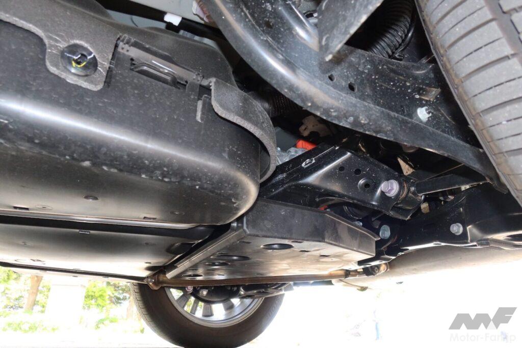 例えばフロントグリル。トリム的にはPHEVと同一仕様のHEV Z Leather Packageがグレーメタリック塗装+メッキモールなのに対し、PHEVはブラックメタリック塗装+スモークメッキモールとなる。また、PHEVの前後バンパーロワは艶ありブラック塗装となる。これらはなかなか難易度の高い識別点だと思うが、ドアハンドルは一目瞭然で、HEVがメッキなのに対し、PHEVはボディ同色となる。もっとも、フロントフェンダーとバックドアに「PLUG-IN HYBRID」のバッジが装着されるので、識別は容易だ。