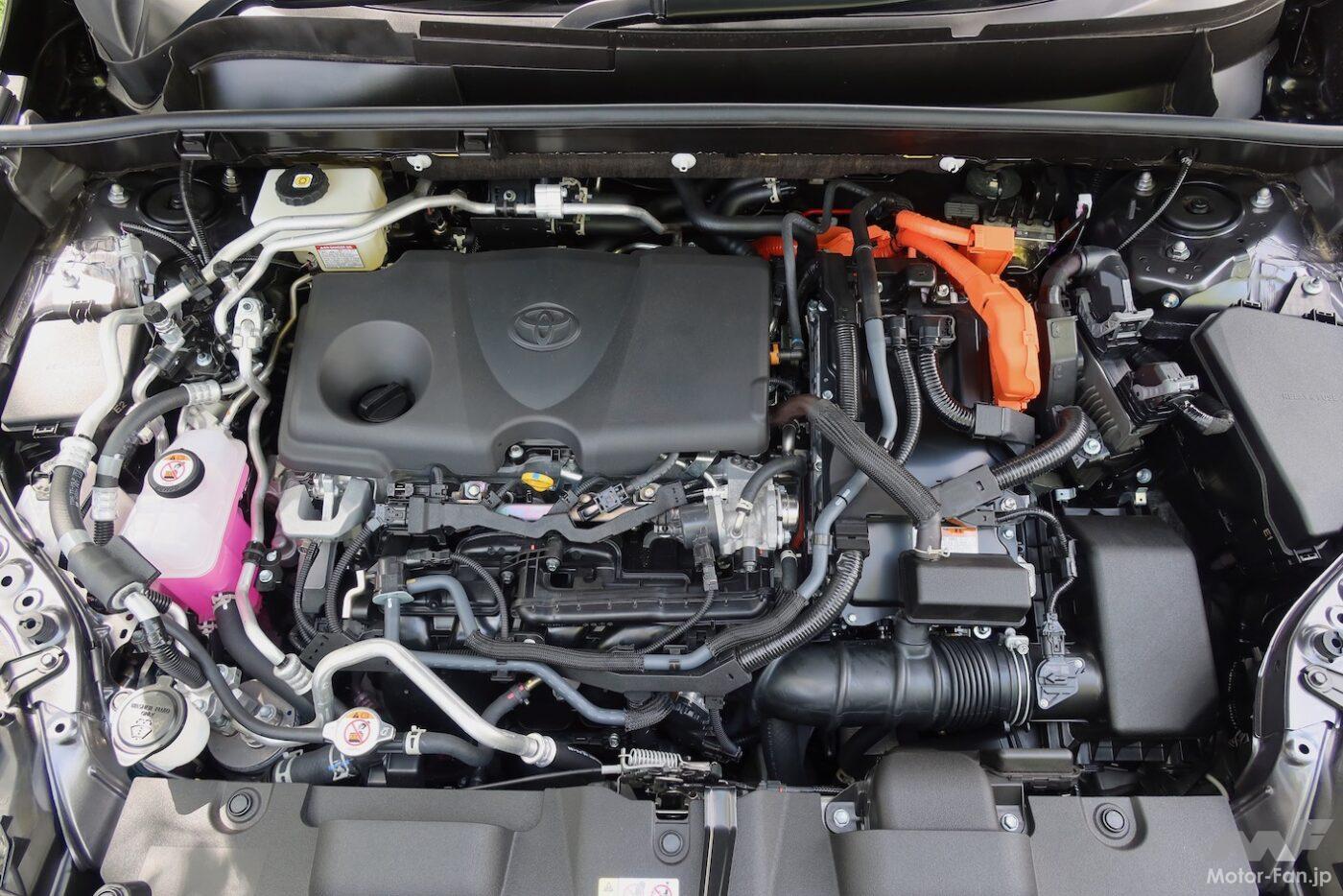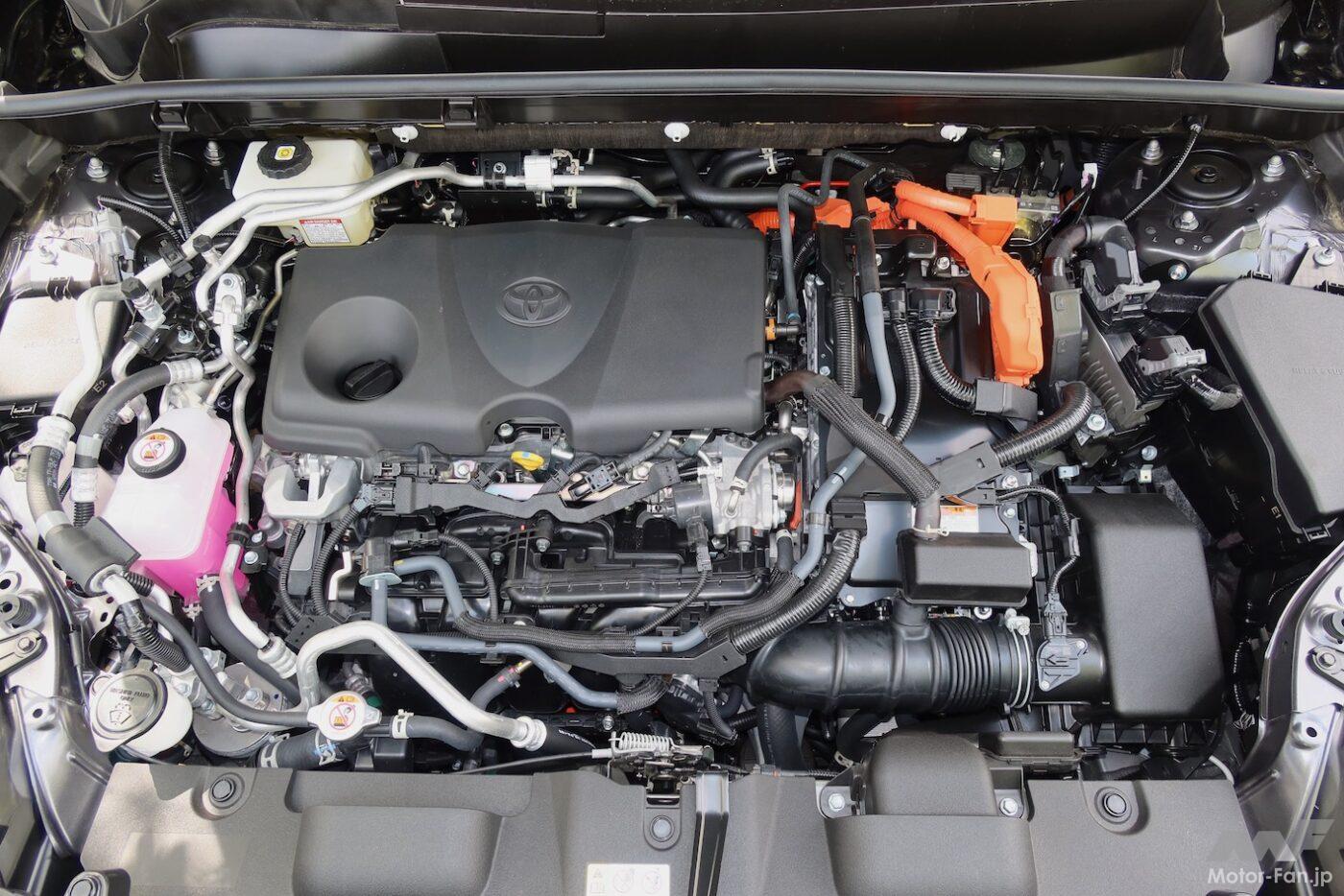 追加されたPHEVは、HEVをベースにしながらフロントモーターを高出力化し、バッテリー総電力量を引き上げ、外部電源からの充電を可能にし、最大1500W(AC100)の外部給電も可能としている。エンジンはHEVと同じA25A-FXS型の2.5L直列4気筒自然吸気を搭載。フロントモーターはHEVの3NM型に対してPHEVは5NM型で、最高出力/最大トルクはHEVの88kW(120ps)/202Nmに対し、PHEVは134kW(182ps)/270Nmを発生する。