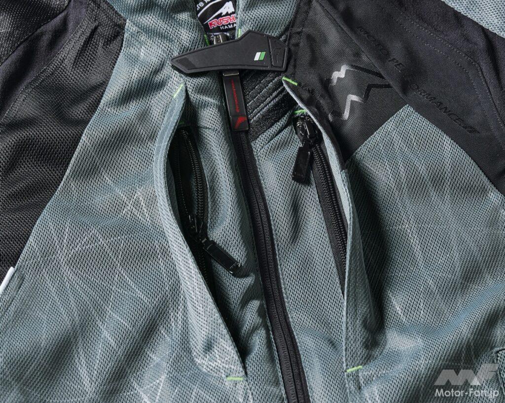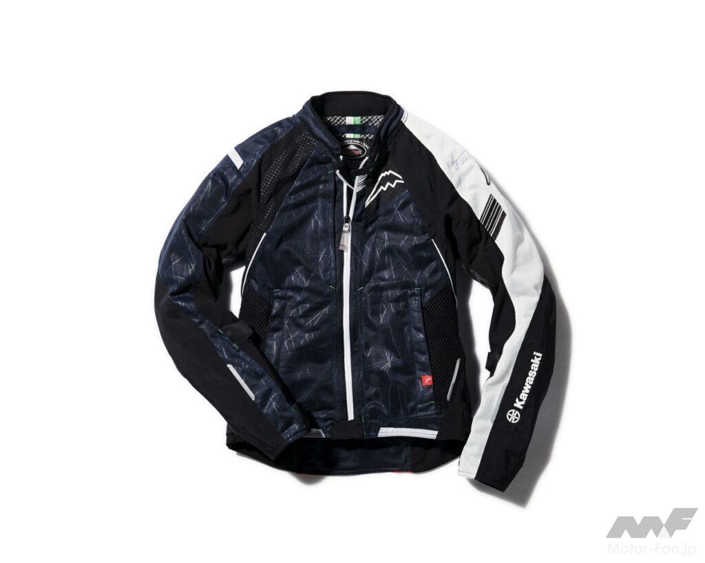 「カワサキ エアコンテンドジャケット」は、クシタニとのコラボによるメッシュジャケットである。特徴的なのはサイズ調整とエアインテークを兼ねたダブルファスナー仕様で、肩・肘・背中にはCEレベル1のプロテクターを標準装備している。