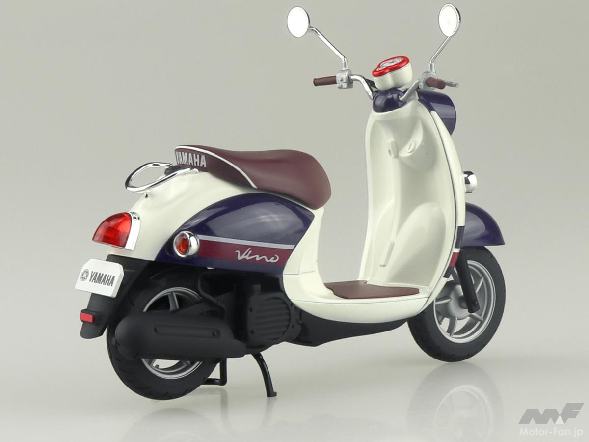 レトロポップなスタイルで人気のビーノを1/12スケールで再現したのが、写真のプラモデル。金型追加で製作された同品は、カラフルな2013年モデルと2016年モデルの2種類をラインナップ。