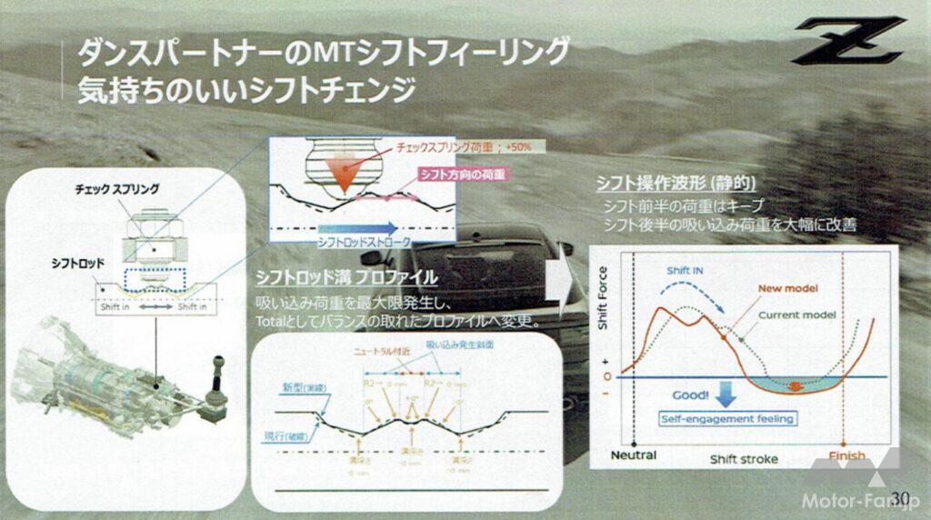 また、クラッチの容量アップを行なったほか、1速と2速のシンクロナイザーはリングの肉厚を薄くし、シンクロ性能を約5%向上させている。クラッチのレリーズは従来、レリーズベアリングを油圧で直接操作するコンセントリックスレーブシリンダー(CSC)を採用していたが、信頼性向上のため、新型Zはコンベンショナルなレバー式に変更。高G加速時のオイルの偏りを抑制するため、オイルパンバッフルプレートを改良した。