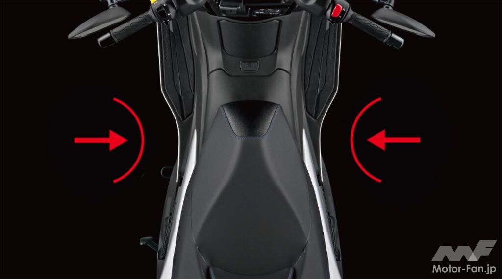 シートや車体がワイドだが、足を下ろしたステップボード周辺のデザインにクビレがある。スズキでは「カットフロアボード」と呼んでいるが、下の俯瞰写真で分かる通り、地面を捉える両足間の接地幅が狭くて済む配慮がなされている。