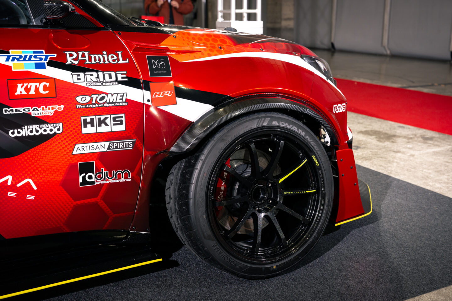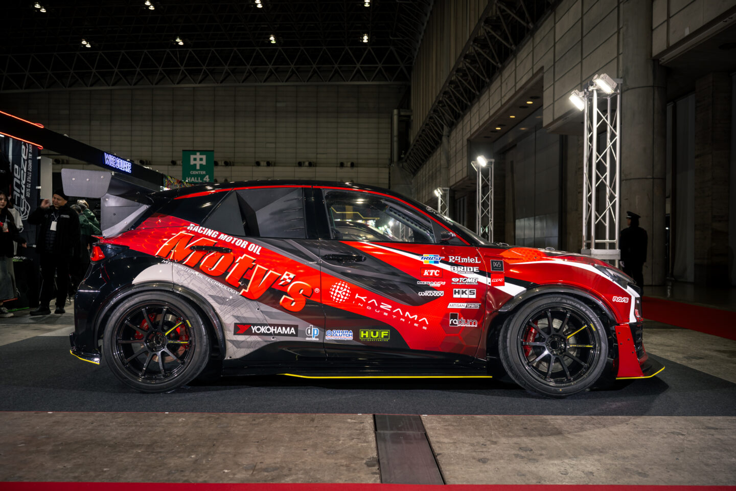 サスペンションには大幅な切れ角アップとトラクションの確保を目的に、ワンオフのカザマインダストリーズ製オリジナルアームキットを導入。こちらは2025年のオートサロンで製作したGRカローラとレイアウトがほとんど同様だったため、設計は比較的スムーズだったという。
