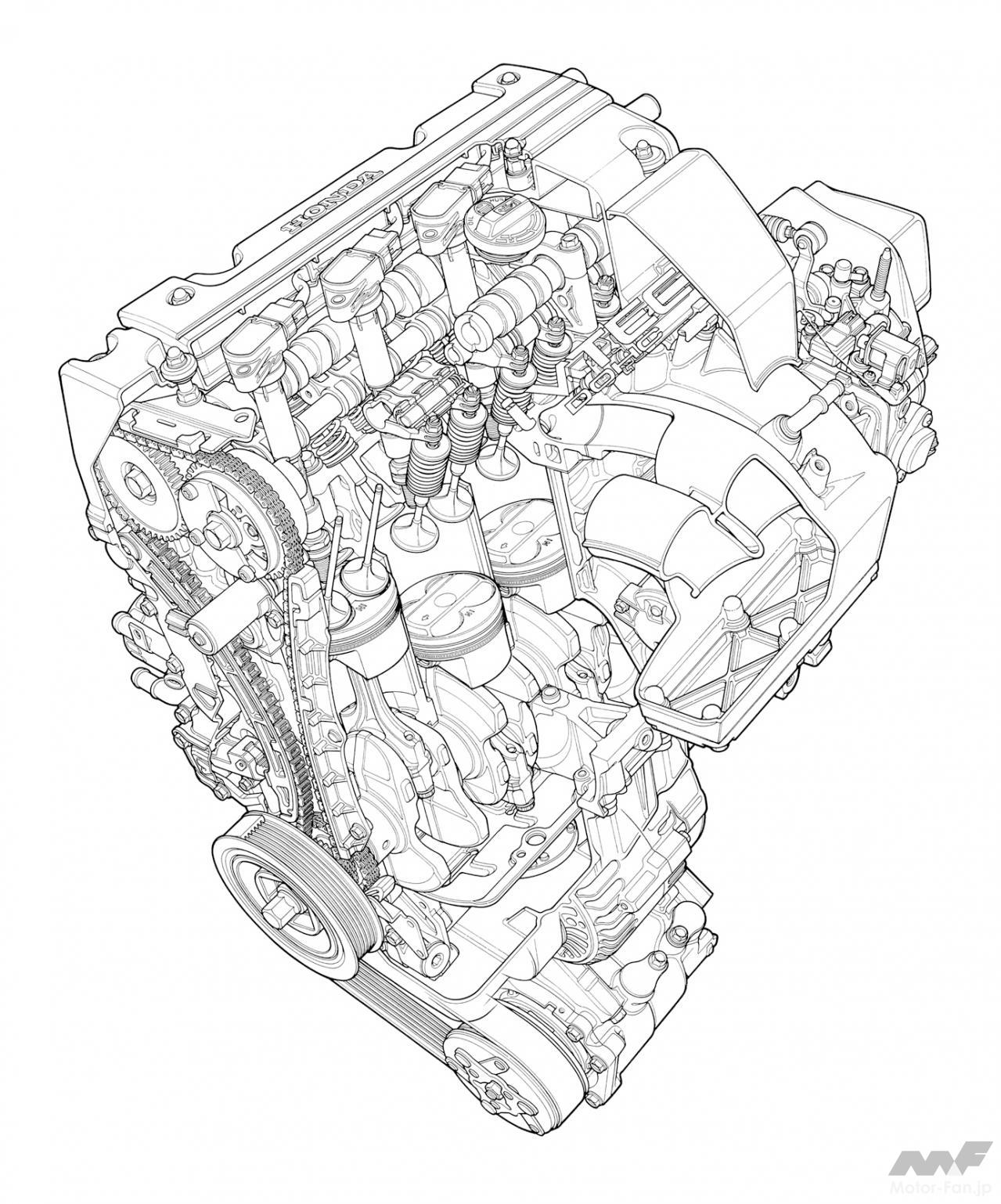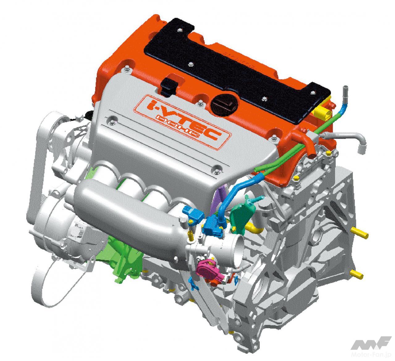 ■ K20A シリンダー配列 直列4気筒 排気量 1998cc 内径×行程 86.0×86.0mm 圧縮比 11.5 最高出力 158kW/8000rpm 最大トルク 202Nm/7000rpm 給気方式 自然給気 カム配置 DOHC ブロック材 アルミ合金 吸気弁/排気弁数 2/2 バルブ駆動方式 ロッカーアーム 燃料噴射方式 PFI VVT/VVL In/◯ (EP3 シビック TYPE R)