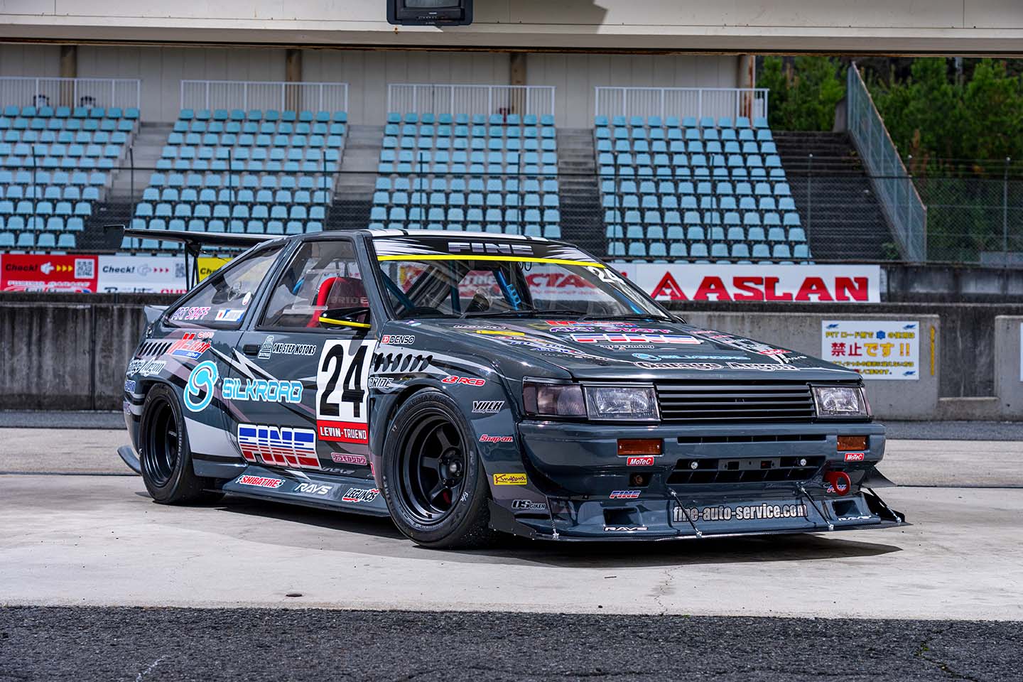 ここに登場するのは、そのN2マシンを代表する一台、AE86。だが、巨大なGTウイングやエアロミラー、エアダクト付きオーバーフェンダーを備えたその佇まいは、当時のN2ハチロクとは少し趣が異なる。
