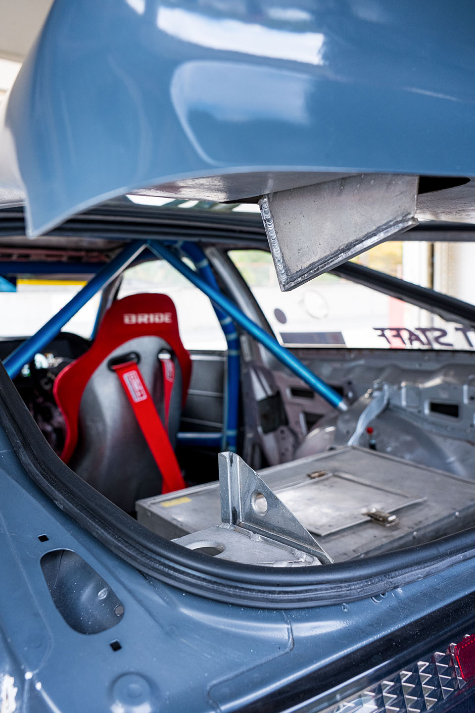 安全タンクや消火器など、必要最小限の装備に留めたインテリアは、ストイックなレーシングカーのオーラを放つ。助手席側にはクールスーツ用の冷却ボックスを設置。GTウイングの効果を最大限に引き出すためフロア直付けとしながら、リヤゲートの開閉性も確保するという、実戦的な工夫も見逃せない。