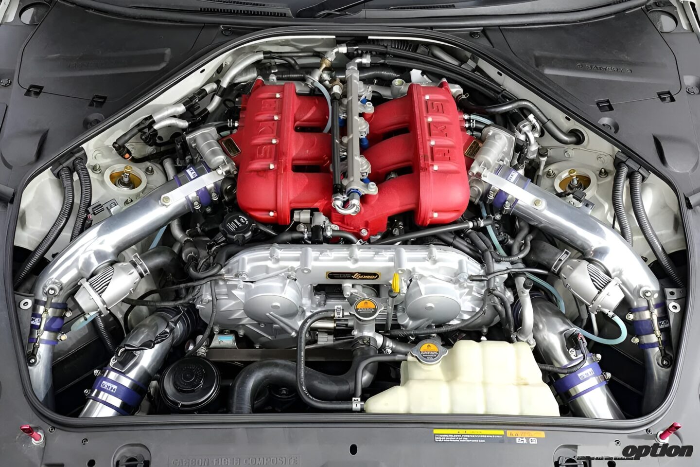 VR38DETTエンジンはHKSキットで4.1Lへ排気量アップ。クランクジャーナルには表面強度と潤滑性向上のDLC、ピストンやピストンリングなどには強度を向上させるWPC加工を追加している。ヘッドもハイカム(IN&EX272度)の投入を軸にくまなく手が入る。