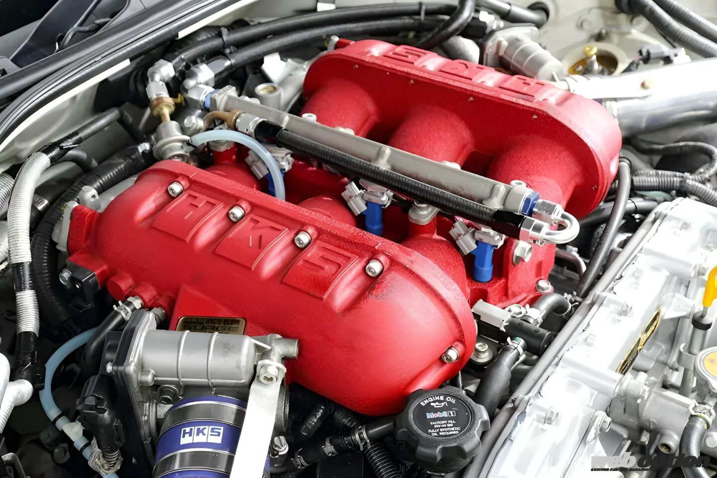吸気効率を向上させるHKS製ハイフローサージタンクのバンク間に見えるデリバリーはフューエルアップグレードキットで、1000psに対応して合計12本の純正インジェクターで燃料を供給している。