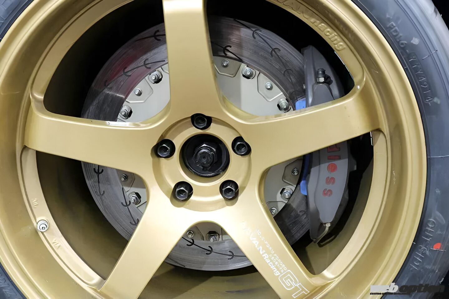 ハイパフォーマンスを受け止めるために、ブレーキも最高峰の性能を持つエンドレスのレーシングモノブロックを選択。ローターはフロント400mm、リヤ387mmのeスリットタイプだ。クーリング用のエアガイドも装備している。