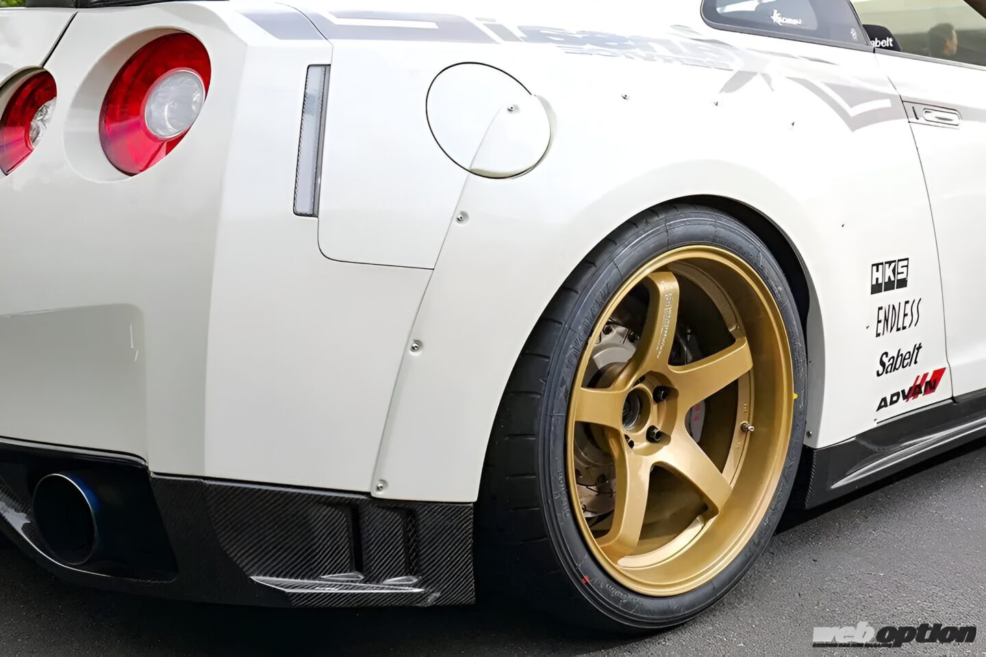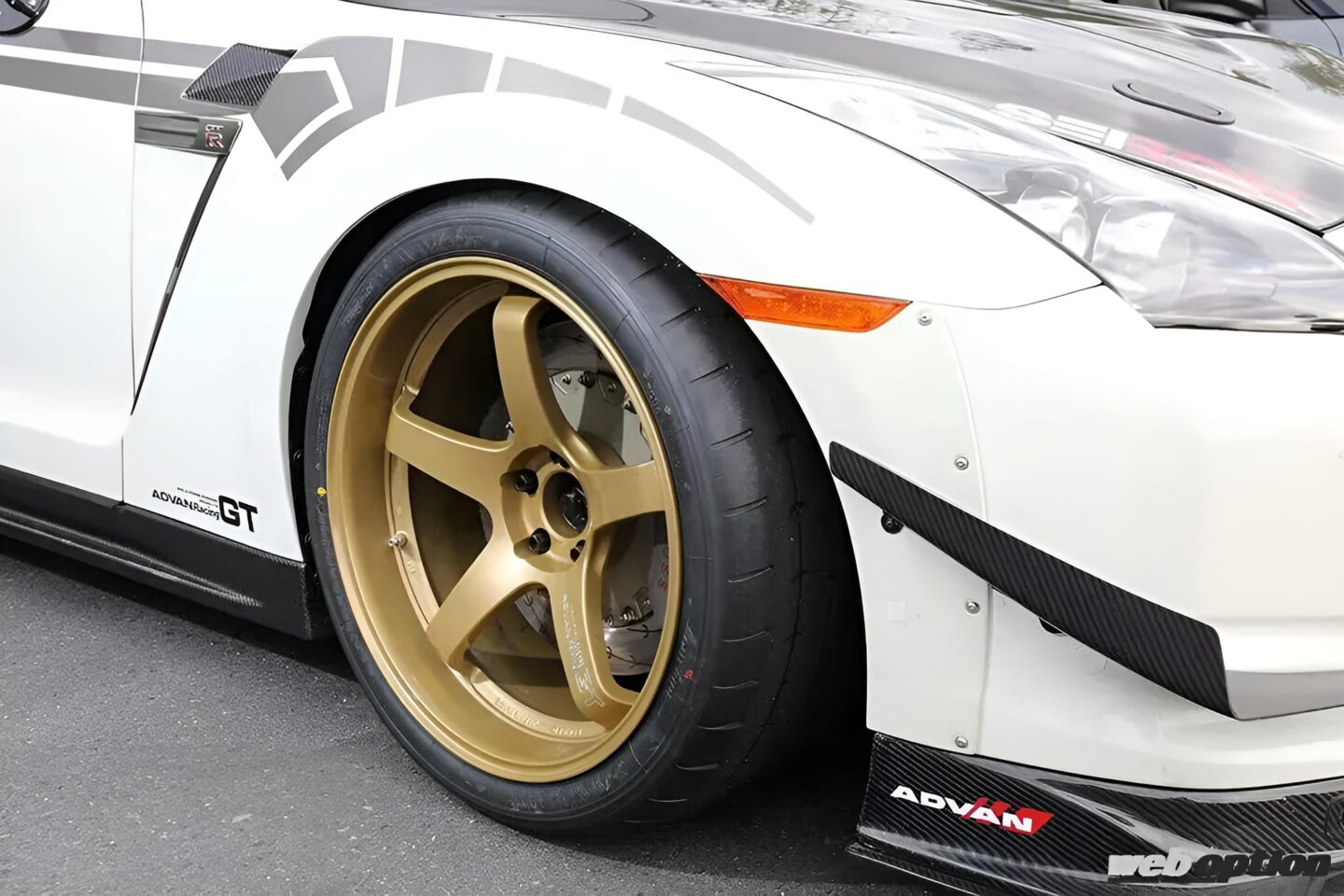 前後共に片側25mmワイド設定のフェンダーに収められているアドバンレーシングGTは、前後とも11Jプラス5。タイヤはGT-R専用の最強ラジアルとして開発された285/35R20サイズのアドバンA08Bだ。