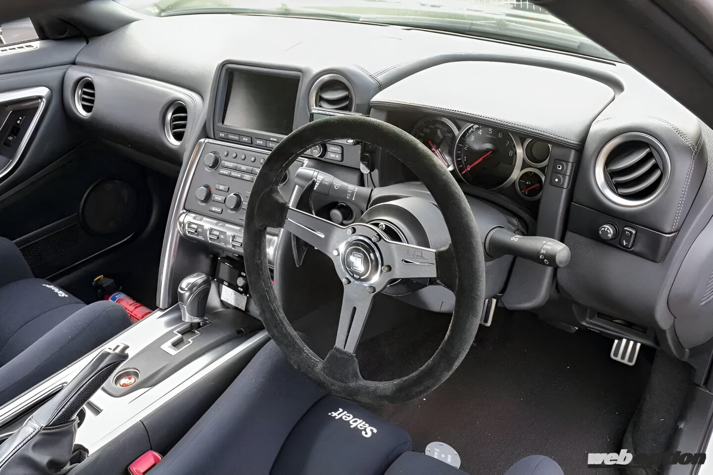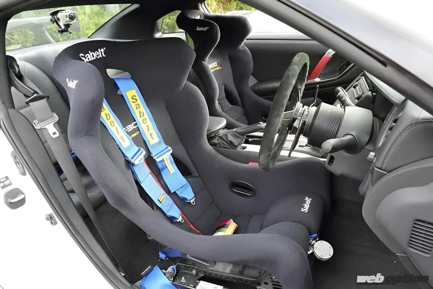 カンサイサービスのオリジナルシートレールを介して装着されるのは、サベルト製のフルバケットシートGT300M。ステアリングはナルディの340φで、ステアリングを切った際にパドルユニットをステアに追従させるMCRパドルシステムを装着。高級感のある厚手のフロアマットはオリジナルだ。