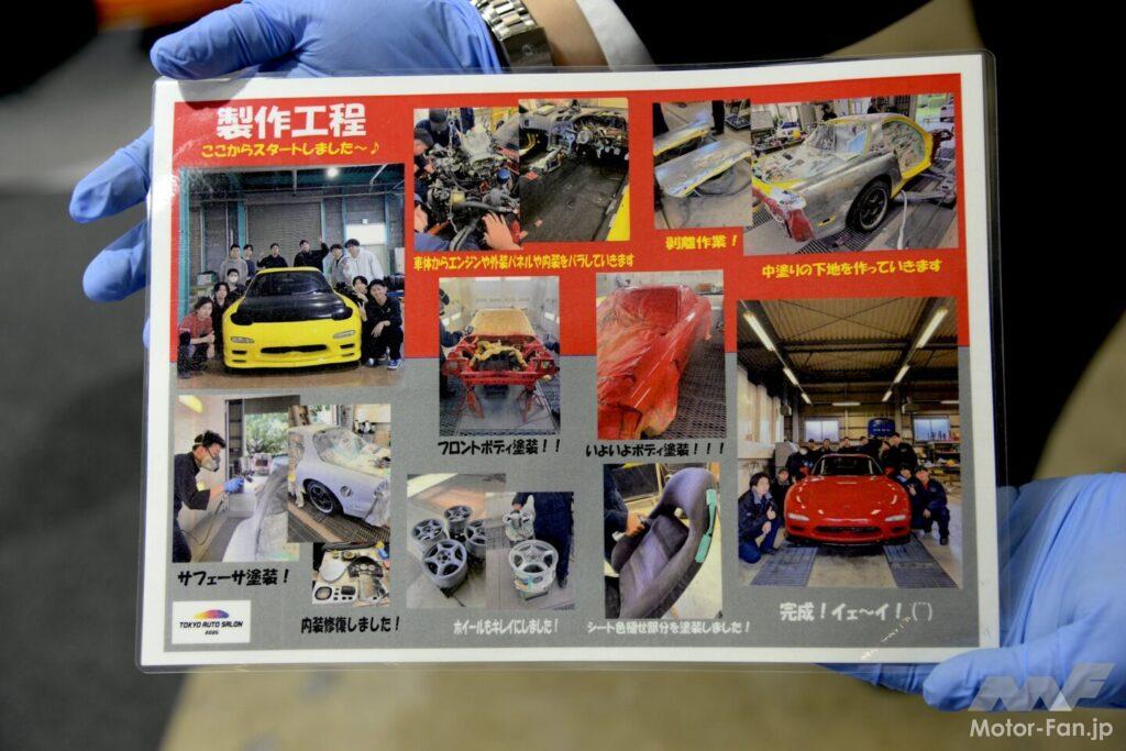 展示されていたのはアンフィニRX-7、FD3Sだ。話しかけてくれた学生は手に持つ写真を示しながら「僕たちでノーマルに戻しました」と語るのだ。聞けば2022年に続いての出展だそうで、その当時はイエローとブラックに塗り分けられたカスタム車だった。2度目の展示にあたり学生たちがテーマにしたのが「純正戻し」だったのだ。