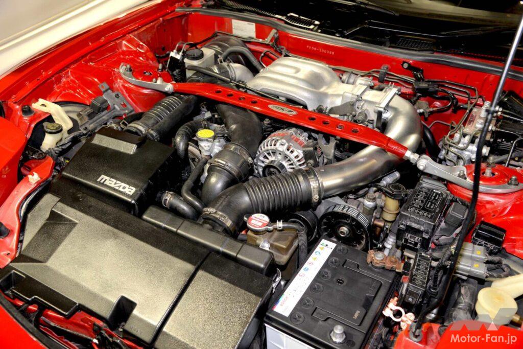 ボディは古い塗装を全面的に剥離してから、純正色を調べて全塗装している。全塗装にあたりエンジン・ミッション・足回りなどは外され、いずれもオーバーホール作業を同時進行させた。そのためエンジンルームを隅々まで見ても古い塗装は残されていない。さらに吸排気系までノーマルにされている。今となってはエアクリーナーケースが残っているFD3Sなど、そうそうないだろう。