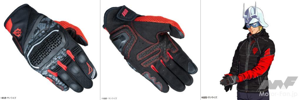 シェードプリントを施したパンチングメッシュ加工の撥水ゴート素材とポリエステル素材で構成されており、KUSHITANI独自開発のナックルプロテクターは通気性を確保した構造を持つ。掌下部には樹脂製パームスライダーを備え、人差し指と親指にはスマートフォン対応のタッチ機能が付いている。ホワイトを基調とした『機動戦士ガンダムUC』のユニコーンガンダムモデルと、ブラックにレッドの差し色を効かせた『機動戦士ガンダム』のシャアモデルの2種類が展開される。価格は14,850円(税込)で、サイズはSからXLまで用意されている。