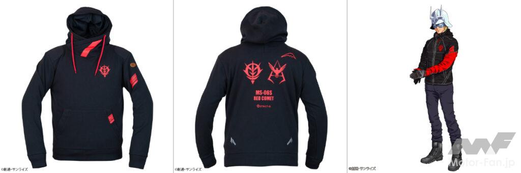 KUSHITANIが独自に開発したダイヤ状の凹凸感のある肉厚な綿タッチの素材を使用。裏面にも凹凸を設け、肌に触れる面積を少なくすることで、より良い着心地を実現している。人気のフードデザインで、『機動戦士ガンダム』のシャアをイメージしたブラックと、『機動戦士ガンダムUC』のユニコーンガンダムのサイコフレームをイメージしたホワイトの2色展開。価格は26,400円(税込)で、サイズはMからXLまで展開されている。