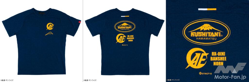 吸汗速乾の杢調のTシャツをベースに、フロントにはKUSHITANIロゴをワンポイントで配置し、バックにはKUSHITANIの楕円富士山ロゴと各タイトルのモチーフをプリントしている。『機動戦士ガンダム』のシャアをイメージしたブラック、『機動戦士ガンダムUC』のユニコーンガンダムをイメージしたホワイト、バンシィをイメージしたネイビーの3色展開。価格は6,380円(税込)で、サイズはSからXLまで展開されている。