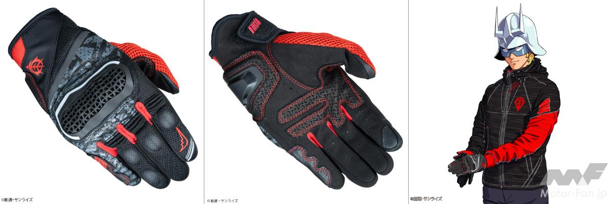 シェードプリントを施したパンチングメッシュ加工の撥水ゴート素材とポリエステル素材で構成されており、KUSHITANI独自開発のナックルプロテクターは通気性を確保した構造を持つ。掌下部には樹脂製パームスライダーを備え、人差し指と親指にはスマートフォン対応のタッチ機能が付いている。ホワイトを基調とした『機動戦士ガンダムUC』のユニコーンガンダムモデルと、ブラックにレッドの差し色を効かせた『機動戦士ガンダム』のシャアモデルの2種類が展開される。価格は14,850円(税込)で、サイズはSからXLまで用意されている。