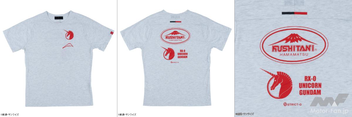 吸汗速乾の杢調のTシャツをベースに、フロントにはKUSHITANIロゴをワンポイントで配置し、バックにはKUSHITANIの楕円富士山ロゴと各タイトルのモチーフをプリントしている。『機動戦士ガンダム』のシャアをイメージしたブラック、『機動戦士ガンダムUC』のユニコーンガンダムをイメージしたホワイト、バンシィをイメージしたネイビーの3色展開。価格は6,380円(税込)で、サイズはSからXLまで展開されている。