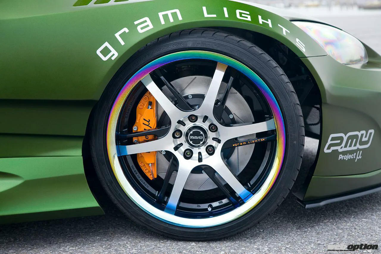 組み合わされるホイールはグラムライツ57アクセレイトPROの19インチ。サイズはフロント8.5J+18、リヤ9.5J+16となり、設定される3種のリムからステンレスリムを採用した。