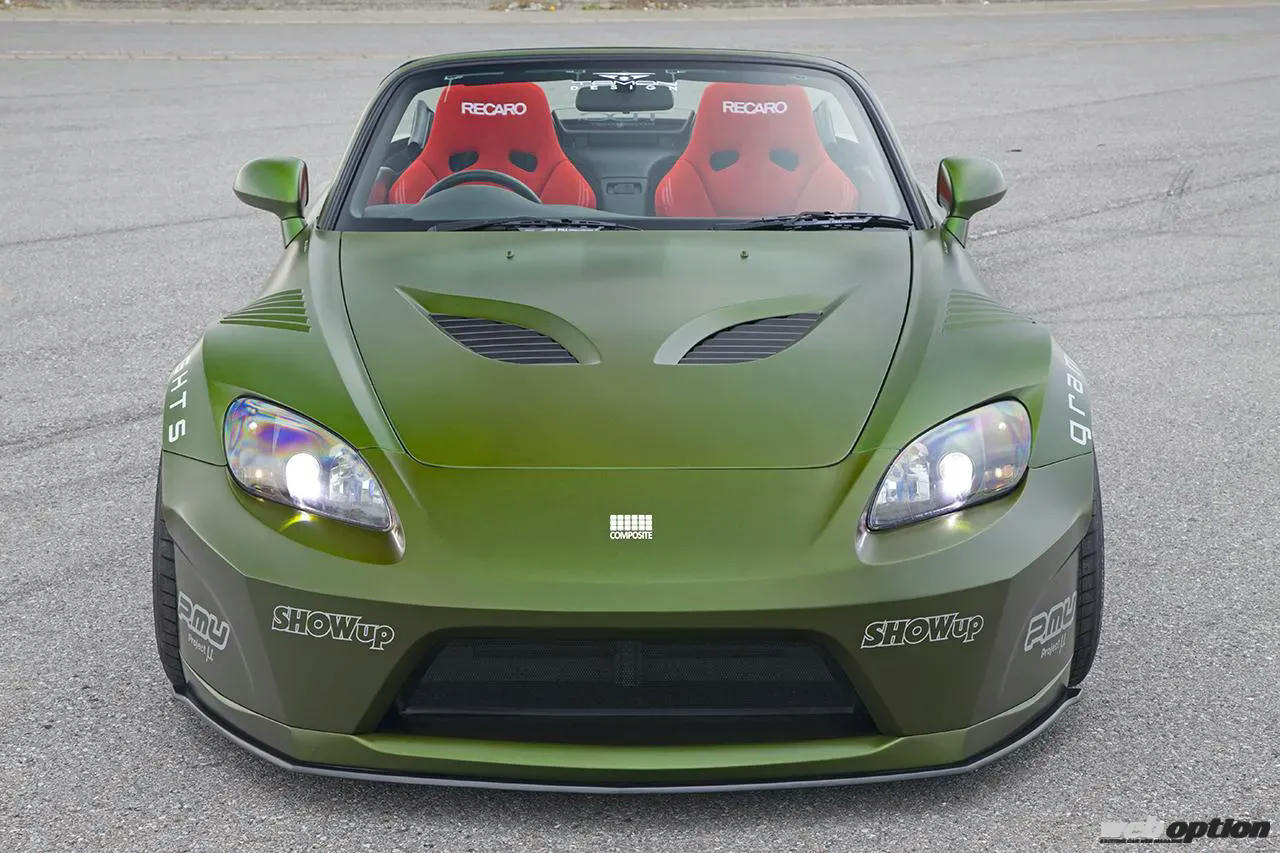 まずフロント。大胆な面構成によってシャープな印象を強めたバンパーデザインがポイントだ。S2000特有のロングノーズはさらに50mmほど延長されているのだが、それを自然に見せるテクニックが随所に盛り込まれているのが分かる。2ピース構造を採用しているのも特徴のひとつで、アンダースウィープ部は写真のストリートバージョンの他、張り出しを大きくしたサーキットバージョンも設定されている。