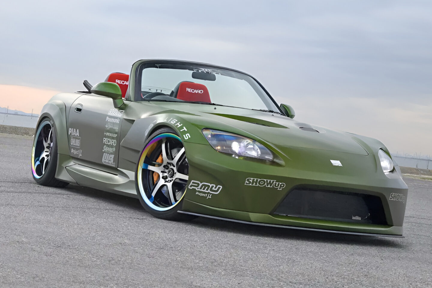 まずフロント。大胆な面構成によってシャープな印象を強めたバンパーデザインがポイントだ。S2000特有のロングノーズはさらに50mmほど延長されているのだが、それを自然に見せるテクニックが随所に盛り込まれているのが分かる。2ピース構造を採用しているのも特徴のひとつで、アンダースウィープ部は写真のストリートバージョンの他、張り出しを大きくしたサーキットバージョンも設定されている。