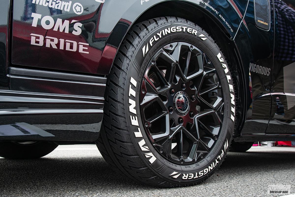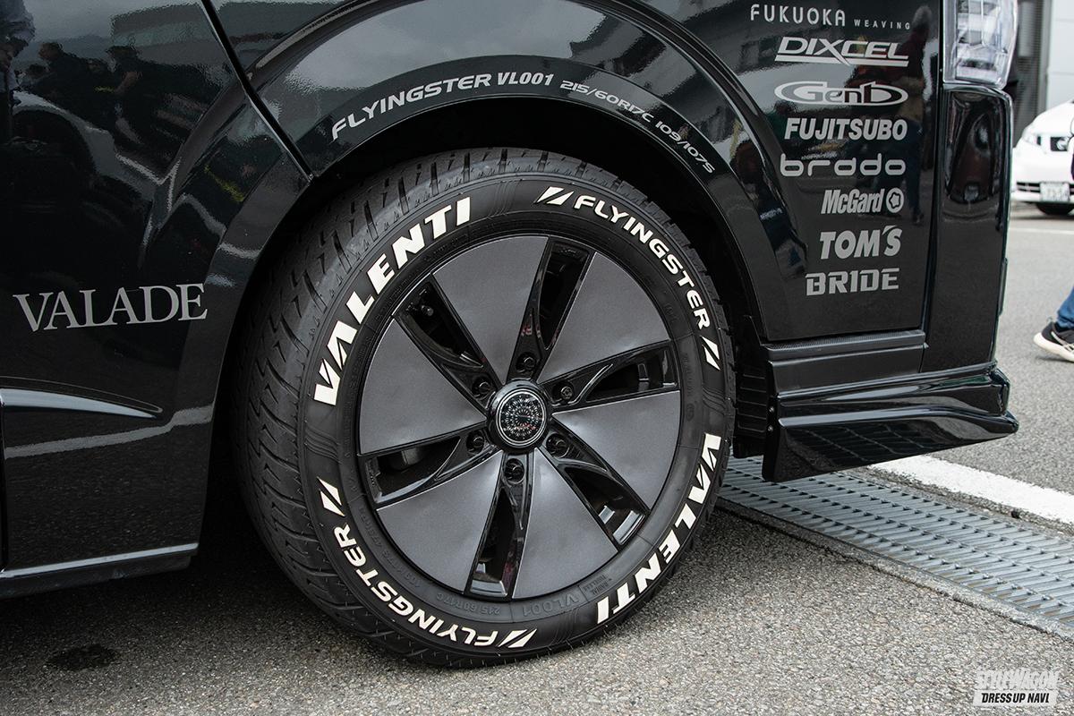 ホイールはハイエース専用設計の「ヴァレード」と「ヴィゴラス」を左右別々に装着。カーボンブレードを採用したヴァレードは風を切るような疾走感のあるディスクデザインを採用。力強さとギミックデザインで足元を飾る「ヴィゴラス」と、ユーザーの好みで選ぶことができる。