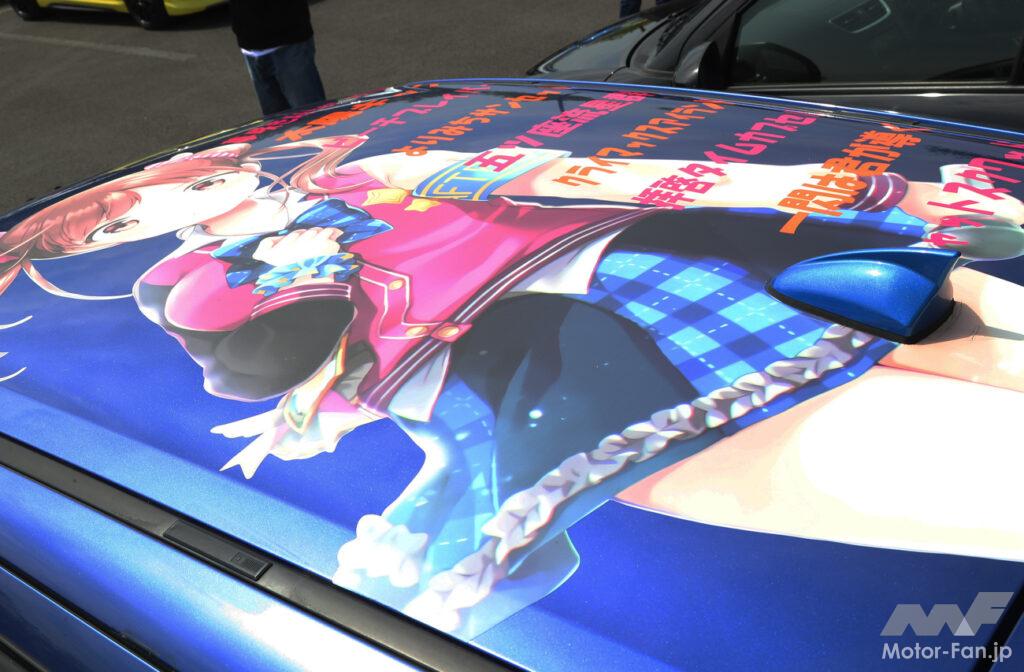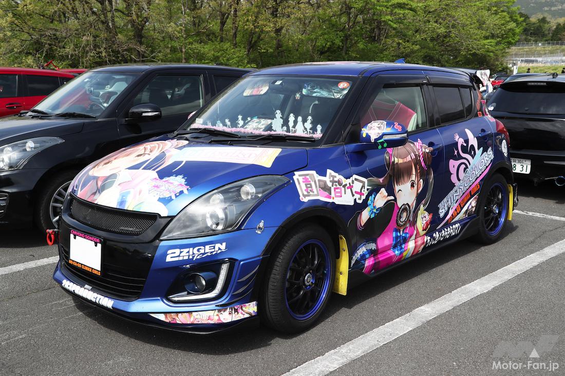 会場内でも一際目立っていた青いスイフトは、可愛いラッピングが施されたいわゆる「痛車」。前後左右、さらにはルーフにまで貼られたこのキャラクターは、スマホ向けブラウザゲーム『アイドルマスター シャイニーカラーズ』に登場する園田智代子。名前にちなんでチョコ好きということで、このスイフトにもあちらこちらにチョコのイラストが散りばめられている。
