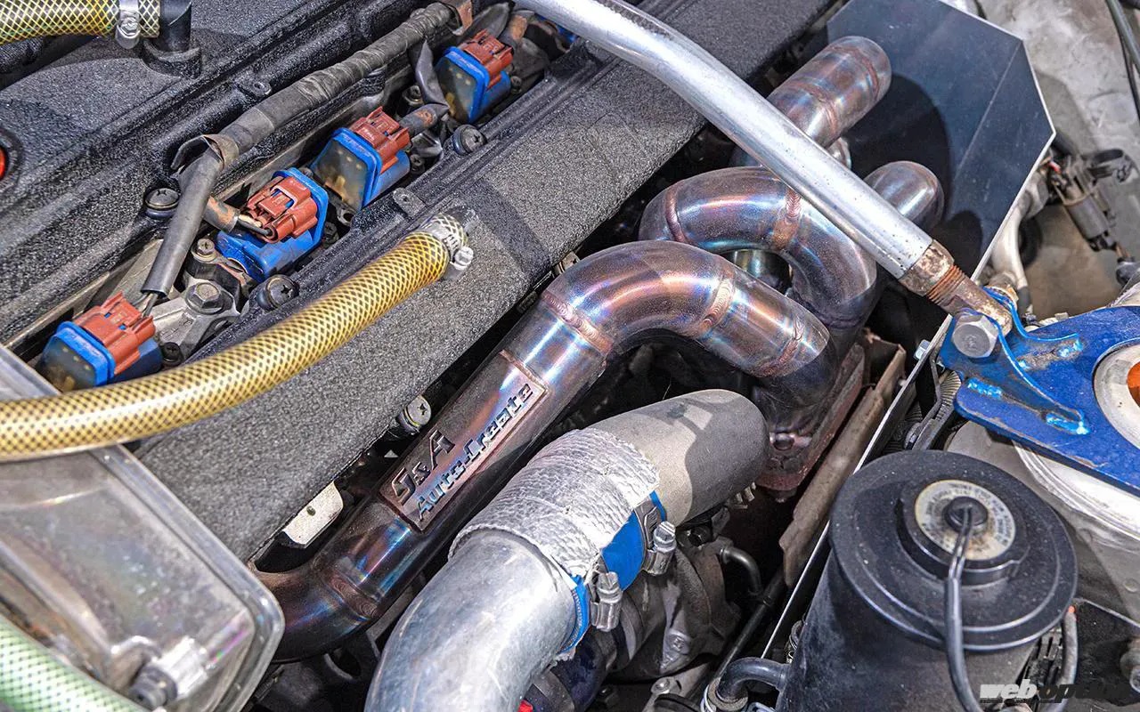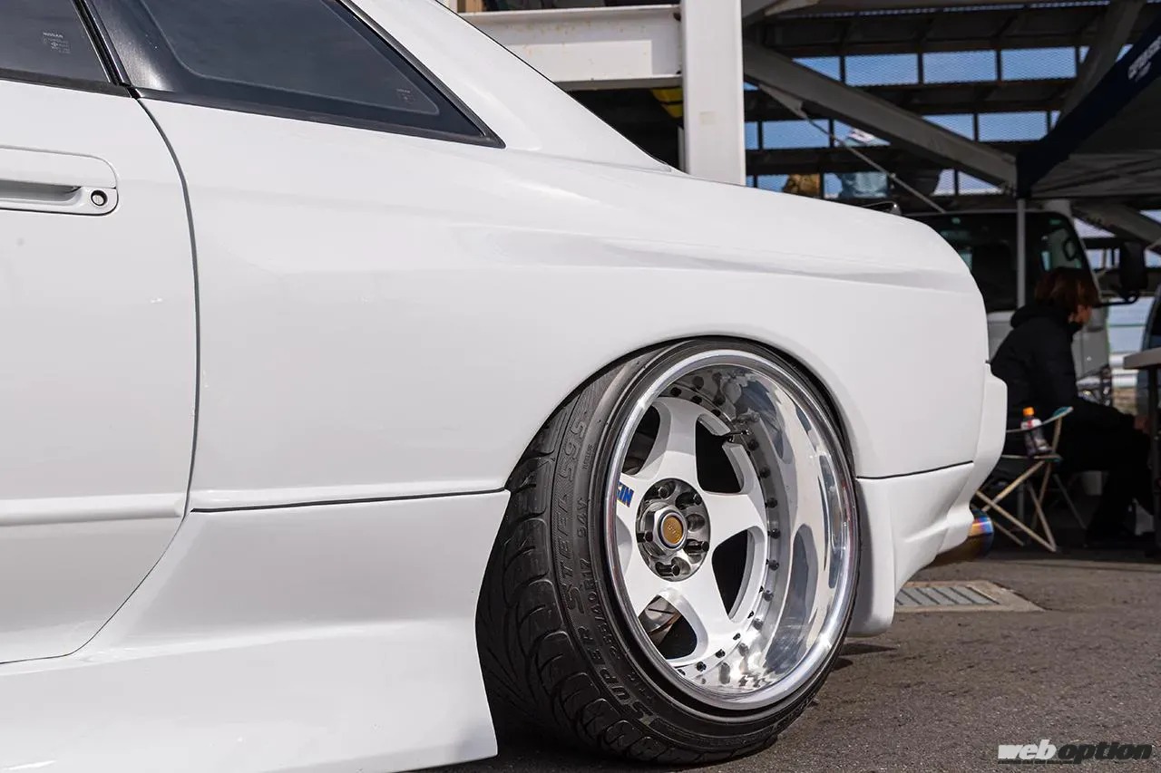 スタイリングに並々ならぬ拘りを感じるが、ドリフト仕様ということでパワーチューニングも抜かりなし。エンジンはRB20DETのまま、GT-R用6連スロットルやS&Aオートクリエイトのベルヌーイエキマニ、HKSのGT2540タービンをセット。制御は純正ECUに専用基板を追加してフルコンに近いマネージメントを行えるNISTUNEが担い、ブースト1.2キロ時に320psを発生させる。