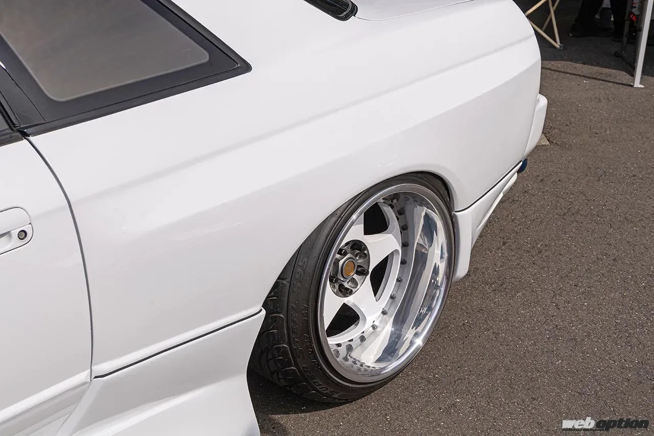 フロントフェンダーはヤナック製をベースに、さらに20mm程度の拡幅を行なったワンオフモデル。トータルでのワイド幅は片側で60mm近いという。かなりの低車高ではあるが、切れ角をアップさせたショートナックル仕様でも問題なく全切りできる形状とされている。