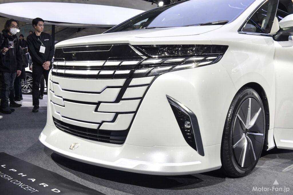 その名はアルファード・モデリスタコンセプト。Mahnific(壮大な)IMPERIAL(威厳)をテーマとしたデザインは、上質感と洗練が濃厚に描き出されたまるでドレスのようなフィニッシュ。特に複雑な造形をストロボライトのように組み合わせたフロントグリル周辺の意匠や、手に触れる場所へのリアルストーンを用いたオーナメントの配置などは、とんでもなく未来的で圧倒的に高品位。全身からオーラがあふれ出すこのアルファードの装いは、もう文句なしにカッコいい。