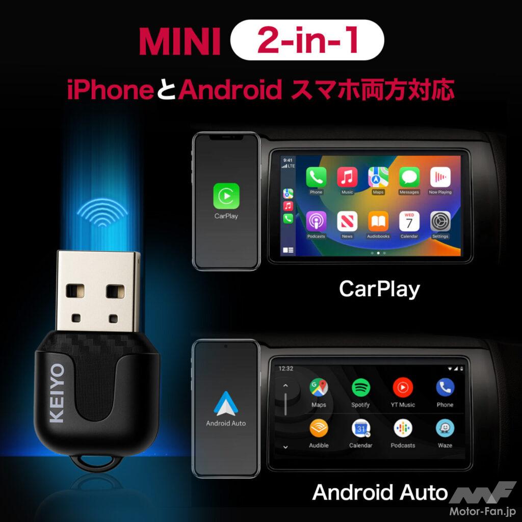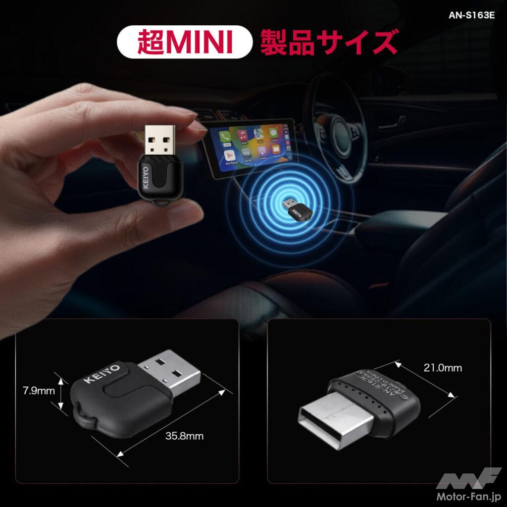 本体は35.8×21×7.9mm、約5gという超コンパクト設計でワイヤレスアダプターとしては業界最小、最軽量クラスとなる。車両のUSBタイプA端子に接続するだけで使えるうえ、目立たずインテリアの雰囲気を損なわない。