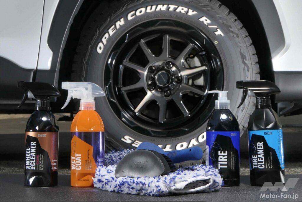 もちろん、タイヤとともにホイールの洗浄&クリーニングも忘れてはいけない。鉄粉を除去する「アイアンリディファイン」で汚れを落とし、その上に施すのはボディにも使用できる「ニューウエットコート」。水と反応することで保護被膜を形成する革新的コーティング剤を使えば、短い施工時間でも満足度の高い効果を手に入れることができるはずだ。