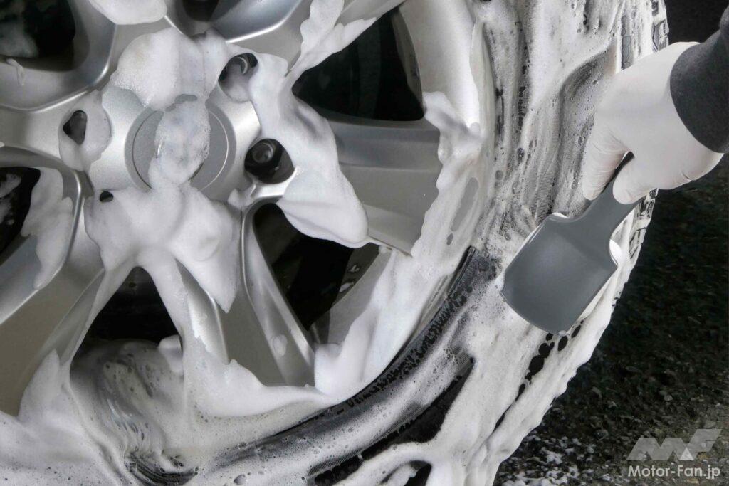 特に見どころと言えるのは、タイヤクリーニングを担当する「タイヤクリーナー」。表面に浮き出た劣化防止剤にまとわりつく汚れを浮かして落とすのはもちろん、タイヤ本来の“色”も復活させてくれるのだ。というのも、近年はアウトドアブームとともにホワイトレタータイヤを選択する人が増えている。このホワイトレタータイヤはカーボンブラックで着色されるのではなく、その名の通り白色のゴムが組み合わされている。そのため、洗浄効果の高いケミカルを使用すれば、本来の白さを蘇らせることができるというわけだ。