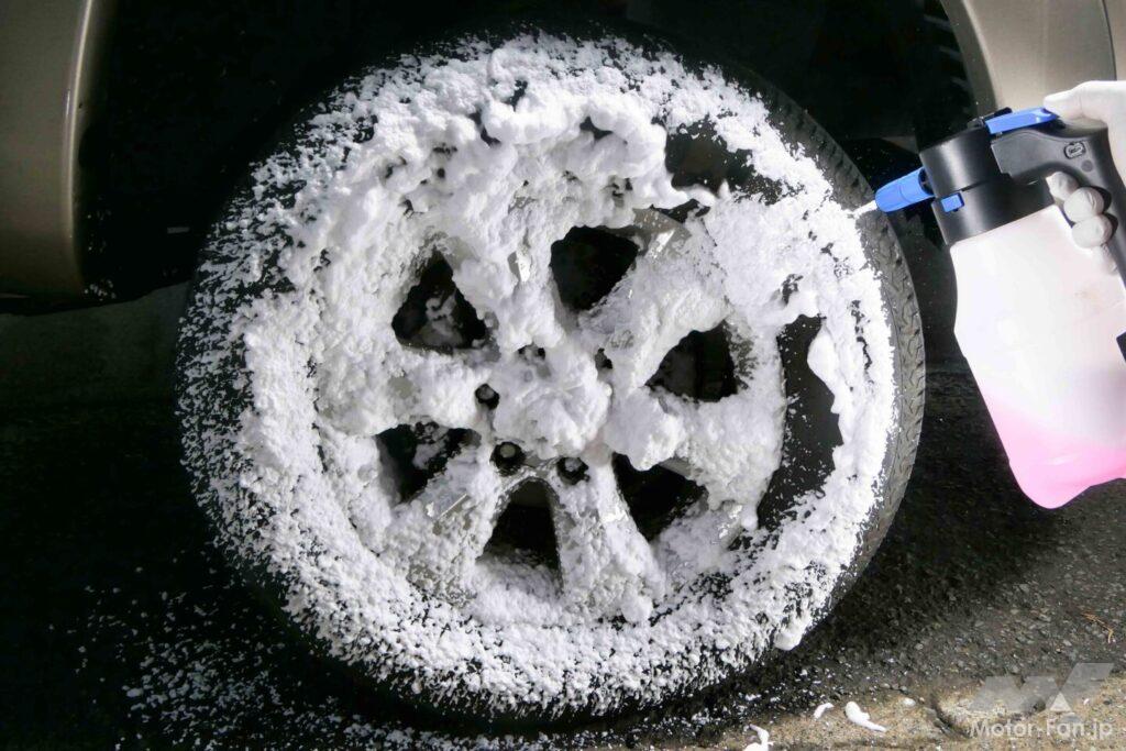 フォームガンで生成する濃密泡は、界面活性剤の成分によってホイールの表面に付着した砂埃もサッと落とし、さらにコーティングが施されていれば、この時点でブレーキダストなどの汚れも洗い流してくれる。そのため、この後に続く洗浄&コーティング作業をスムーズに行なえるようになるメリットも大きい。