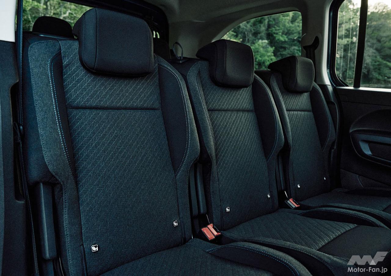 3座独立のリヤシートは、ゆったりとした同じ座面幅を確保し、長距離のドライブでも疲れにくい設計だ。ドブロ・マキシに設定されている3列目の2座独立シートは、130mmのスライド幅に加えて、脱着も可能。用途に合わせて多彩にシートアレンジできる。