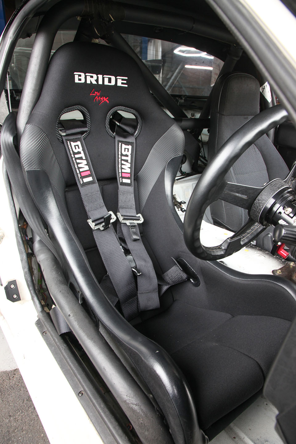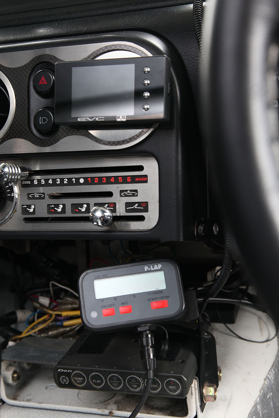 レブリミットは8500rpmに設定され、サーキットでは8000rpmを目安にシフト。ブースト圧を0.9キロに抑えているのは純正5速MTを守るためだ。というのも以前、YZサーキットを1.3キロで走らせたところ、たった1周半でミッションが飛んだ苦い経験があるからに他ならない。