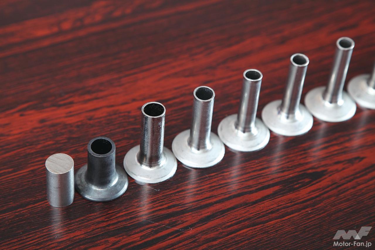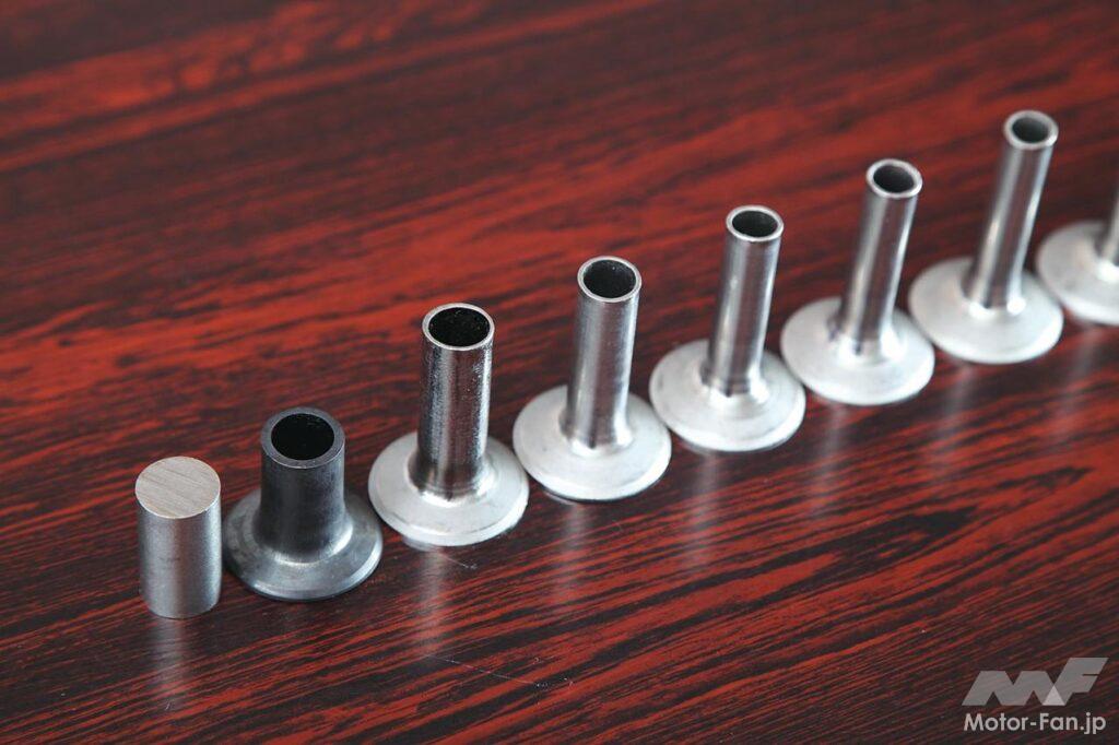 一般に中実ポペットバルブは傘部の基となる金属丸棒と軸の基となる金属丸棒を溶接、傘部側の金属丸棒を加熱成形(アプセット鍛造)して傘部を形作る。このため傘部と軸の間に接合部が来る。これを傘側から開孔して中空化を企図した、さる欧州製バルブは傘部の栓も必要となるため、さらに接合部が増える結果となった。接合部が少ないほど信頼性は高まる。もとより軽量だから衝撃荷重も低い。すなわちバルブ由来のエンジン故障の可能性は極めて低くなる。