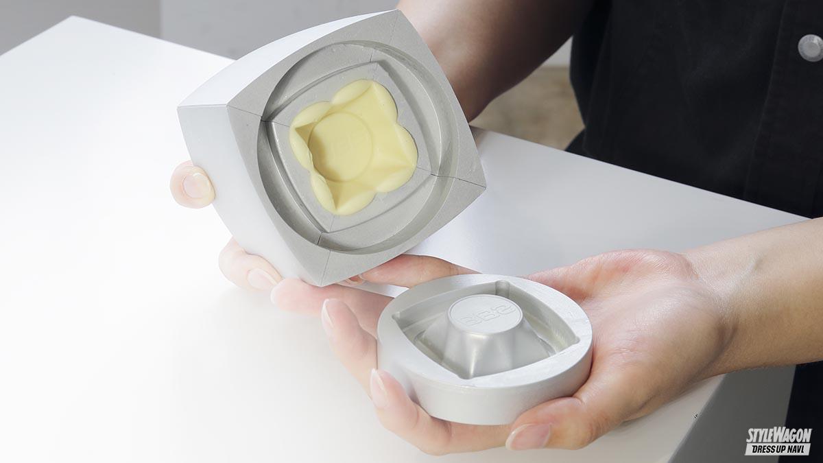 花びらをモチーフにしたオシャレな金型に溶かしたチョコレートを流し込む。すると出来上がってきたのは、クルマ好きであればひと目で分かる、BBSのホイールをイメージしたチョコレート。思わず口に運ぶのをためらってしまうほど、リアルに仕立てられている。
