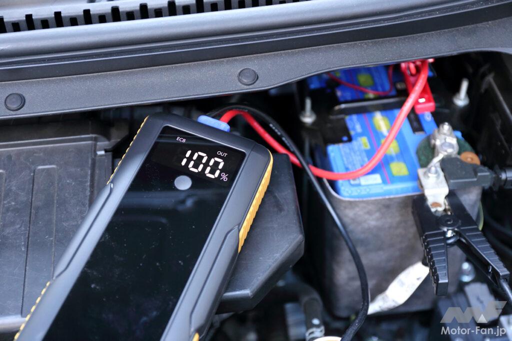 このスーパーキャパシタジャンプスターターの最大のメリットは、事前に充電する必要がなく、スタンドアローンで解決できるということ。使い方も簡単で、弱ったバッテリーのプラスとマイナス端子に接続すれば自動で電気の吸い上げを開始。内蔵のキャパシタに100%充電が完了したら、セルスタートボタンを押してエンジン始動。これでバッテリー上がりは解決だ。ただし、長期間放置していて完全に弱ったバッテリーでは、始動不可能という場合もあるので、あくまで走行中のバッテリー上がりに対応するアイテムということを認識しておこう。