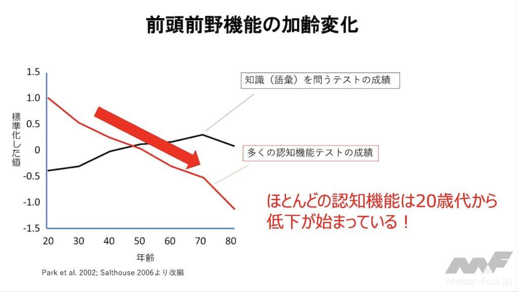 前頭前野の機能は20歳前後を頂点として加齢に伴い低下する。昨今はクルマに安全装備が標準化され、交通事故数そのものは減少傾向にある。しかしその中でも運転に慣れていない若年層に次いで、高齢層における事故の比率は高い。高齢者の事故の背景には、加齢変化が影響している可能性が高い。ただし、加齢が必ずしも運転不能を意味するわけではなく、適切な介入により機能低下を改善することが可能であるという点が、研究の重要なポイントである。