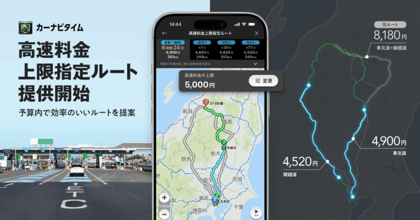 ナビタイムジャパンのスマホ向け(iPhone / Android)カーナビアプリ、『カーナビタイム』が新たに『高速料金上限指定ルート』の提供を開始した。